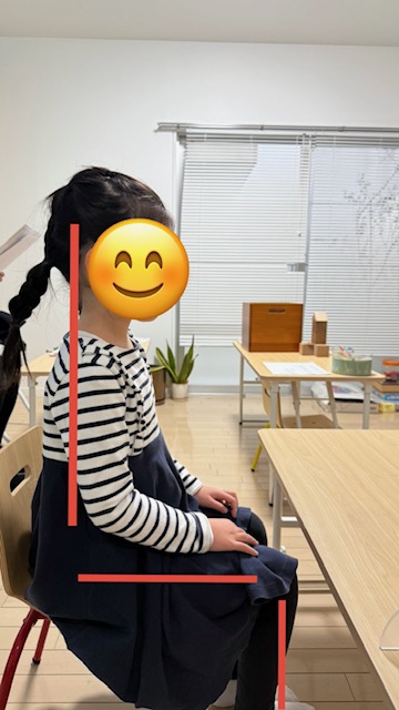 すわる時は背中は丸めずそらしすぎず、腰からすっと真っ直ぐに。お子様の身体の成長の為にもとても大切なことですので、丸まっているな、という時はお声かけしてあげて下さい。中々すぐには身につきませんが、毎日の繰り返しが大切です。